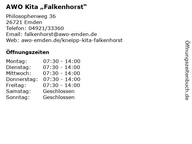 | Öffnungszeiten AWO Kita „Falkenhorst“ in Emden anzeigen | |