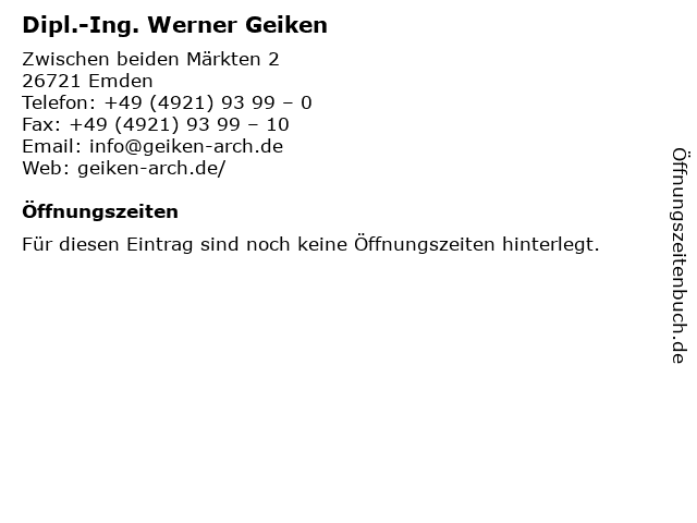| Öffnungszeiten Dipl.-Ing. Werner Geiken in Emden anzeigen | |