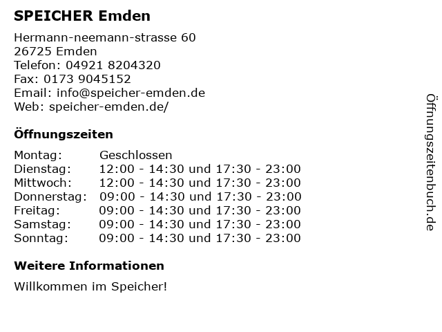 | Öffnungszeiten SPEICHER Emden in Emden anzeigen | |