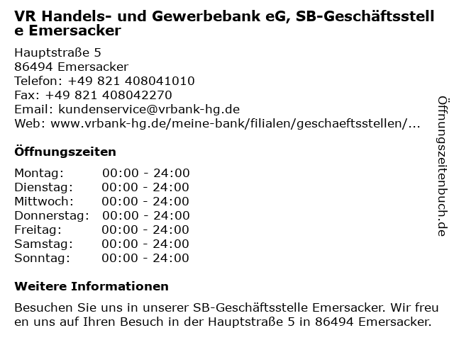 1 VR-Bank Handels- und Gewerbebank eG - (Geldautomat) (Entfernung: 0,00 km) Hauptstraße 5, 86494 Emersacker 2 VR-Bank Handels- und Gewerbebank eG - Geschäftsstelle Emersacker (Entfernung: 0,00 km) Hauptstraße 5, 86494 Emersacker 4 VR-Bank Handels-und Gewerbebank eG (Geldautomat) (Entfernung: 0,15 km) Raiffeisenstr. 1, 86494 Emersacker 6 VR-Bank Handels-und Gewerbebank eG (Geldautomat) (Entfernung: 4,75 km) Raiffeisenstr. 1, 86502 Laugna |