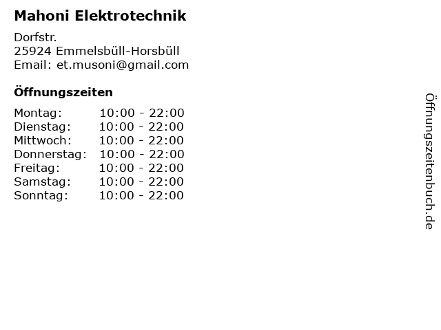 | Öffnungszeiten Mahoni Elektrotechnik in Emmelsbüll-Horsbüll anzeigen | |