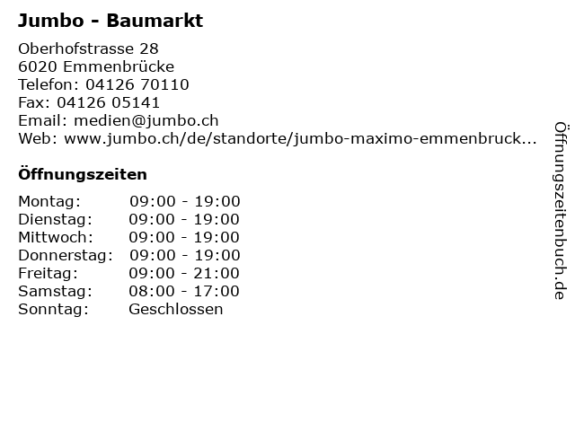 | Öffnungszeiten Jumbo - Baumarkt in Emmenbrücke anzeigen | |