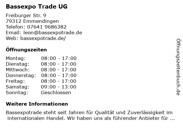 | Öffnungszeiten Bassexpo Trade UG in Emmendingen anzeigen | |