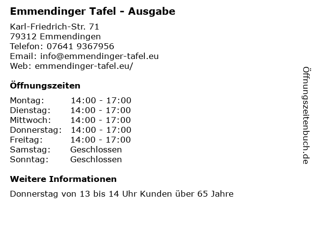 1 Emmendinger Tafel (Verkauf sämtlicher Lebensmittel) (Entfernung: 0,00 km) Karl-Friedrich-Str. 71, 79312 Emmendingen 3 Tafel Herbolzheim Außenstelle Endingen (Entfernung: 10,66 km) Königschaffhauserstr. 9, 79346 Endingen 4 5 Freiburger Tafel - Ausgabe der Kundenkarten (Entfernung: 14,84 km) Schwarzwaldstr. 58a, 79102 Freiburg 6 |