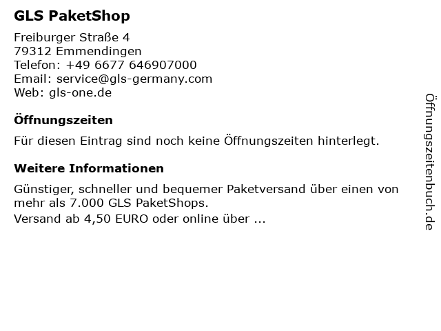 | Öffnungszeiten GLS PaketShop in Emmendingen anzeigen | |