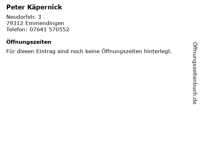| Öffnungszeiten Peter Käpernick in Emmendingen anzeigen | |
