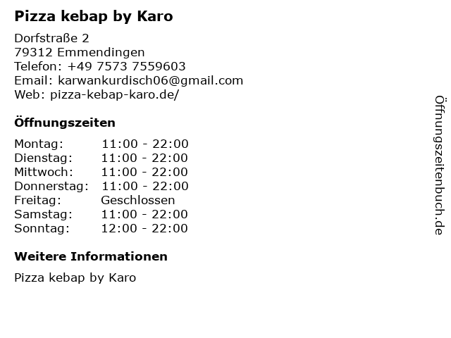 | Öffnungszeiten Pizza kebap by Karo in Emmendingen anzeigen | |