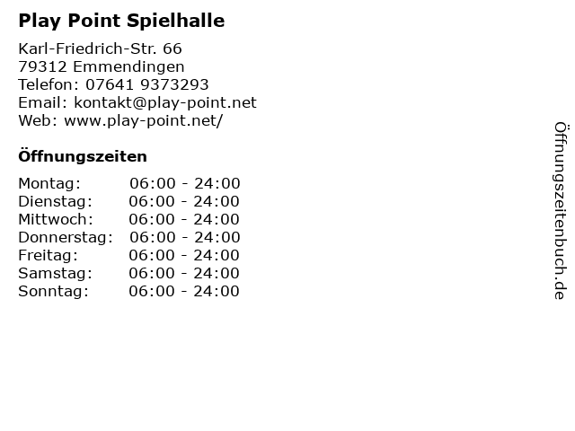 | Öffnungszeiten Play Point Spielhalle in Emmendingen anzeigen | |