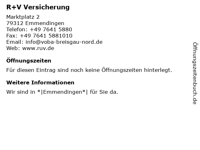 | Öffnungszeiten R+V Versicherung in Emmendingen anzeigen | |