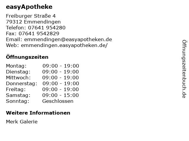 | Öffnungszeiten easyApotheke in Emmendingen anzeigen | |