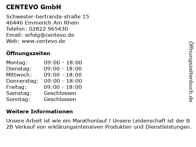 | Öffnungszeiten CENTEVO GmbH in Emmerich Am Rhein anzeigen | |