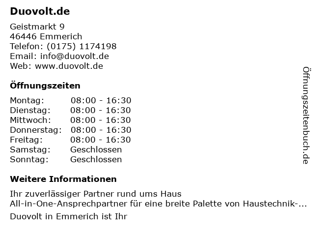 | Öffnungszeiten Duovolt.de in Emmerich anzeigen | |