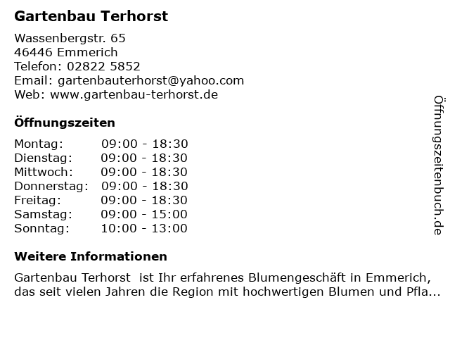 | Öffnungszeiten Gartenbau Terhorst in Emmerich anzeigen | |
