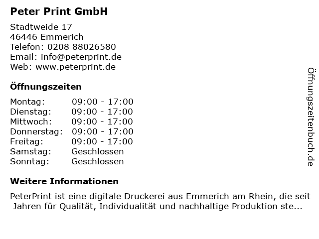 | Öffnungszeiten Peter Print GmbH in Emmerich anzeigen | |