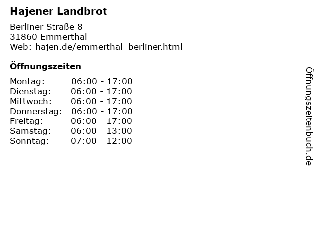 | Öffnungszeiten Hajener Landbrot in Emmerthal anzeigen | |