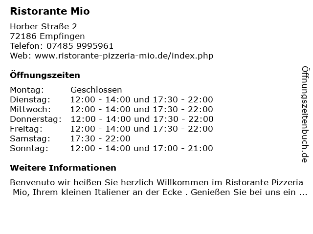 | Öffnungszeiten Ristorante Mio in Empfingen anzeigen | |