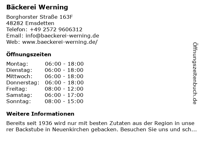 | Öffnungszeiten Bäckerei Werning in Emsdetten anzeigen | |