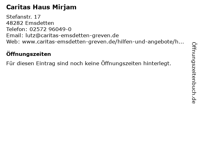 | Öffnungszeiten Caritas Haus Mirjam in Emsdetten anzeigen | |