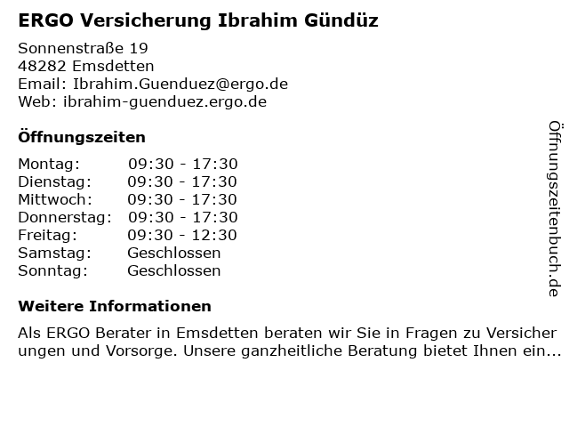 | Öffnungszeiten ERGO Versicherung Ibrahim Gündüz in Emsdetten anzeigen | |