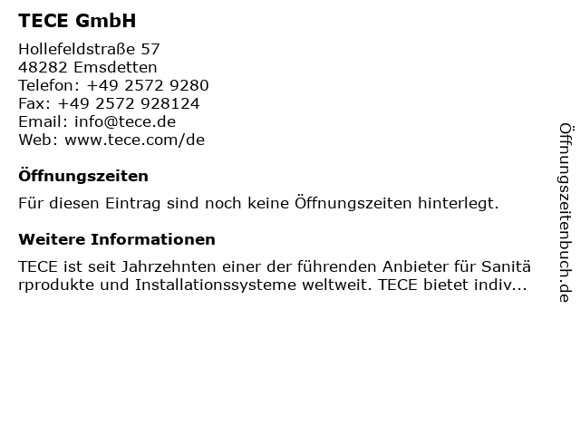 | Öffnungszeiten TECE GmbH in Emsdetten anzeigen | |