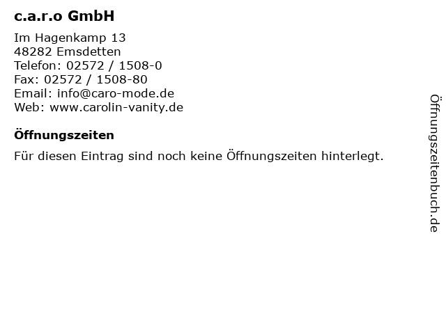 | Öffnungszeiten c.a.r.o GmbH in Emsdetten anzeigen | |