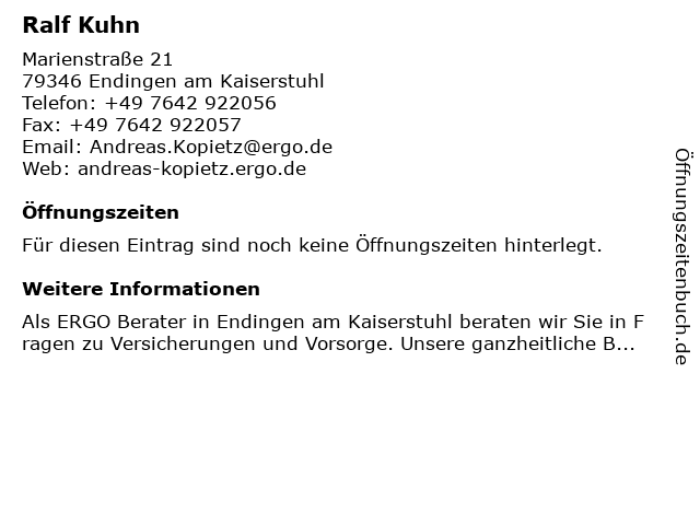 | Öffnungszeiten Ralf Kuhn in Endingen am Kaiserstuhl anzeigen | |