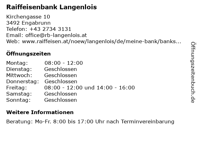 | Öffnungszeiten Raiffeisenbank Langenlois in Engabrunn anzeigen | |