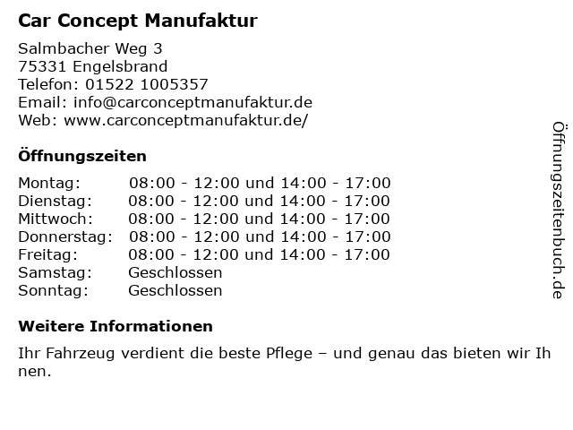| Öffnungszeiten Car Concept Manufaktur in Engelsbrand anzeigen | |