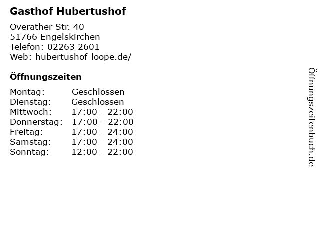 | Öffnungszeiten Gasthof Hubertushof in Engelskirchen anzeigen | |