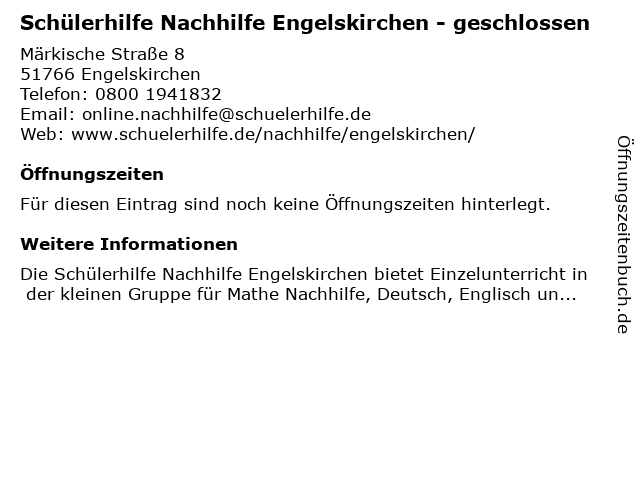| Schülerhilfe Nachhilfe Engelskirchen - geschlossen anrufen | |