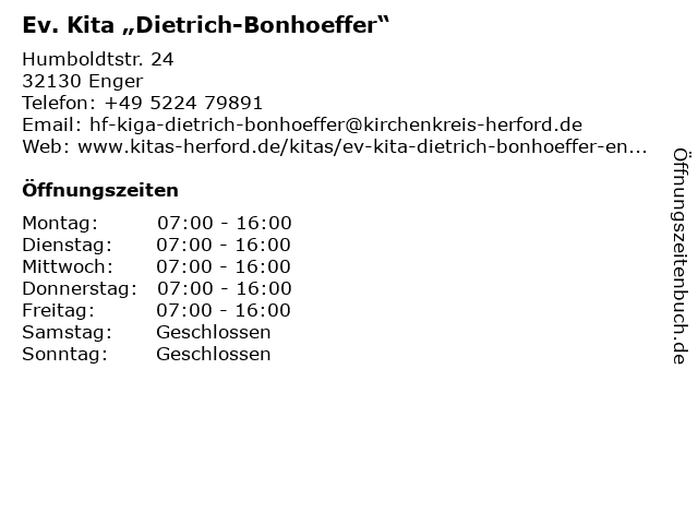 | Öffnungszeiten Ev. Kita „Dietrich-Bonhoeffer“ in Enger anzeigen | |