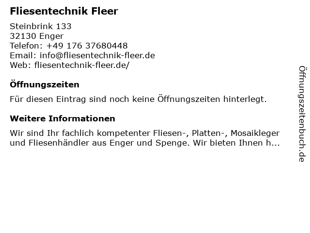 | Öffnungszeiten Fliesentechnik Fleer in Enger anzeigen | |
