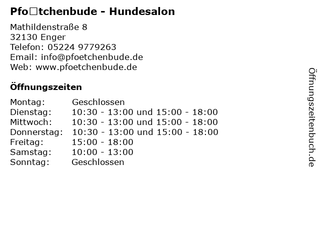 | Öffnungszeiten Pfötchenbude - Hundesalon in Enger anzeigen | |