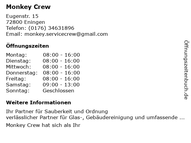 | Öffnungszeiten Monkey Crew in Eningen anzeigen | |