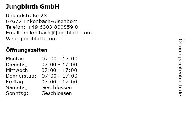| Öffnungszeiten Jungbluth GmbH in Enkenbach-Alsenborn anzeigen | |