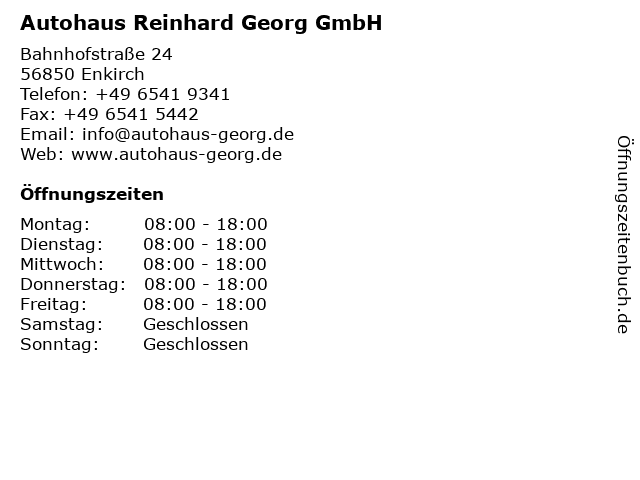 | Öffnungszeiten Autohaus Reinhard Georg GmbH in Enkirch anzeigen | |