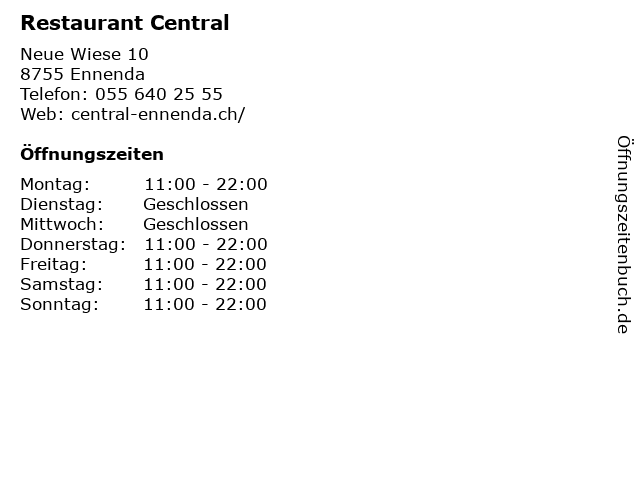 | Öffnungszeiten Restaurant Central in Ennenda anzeigen | |