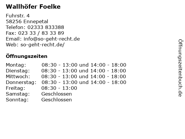| Öffnungszeiten Wallhöfer Foelke in Ennepetal anzeigen | |