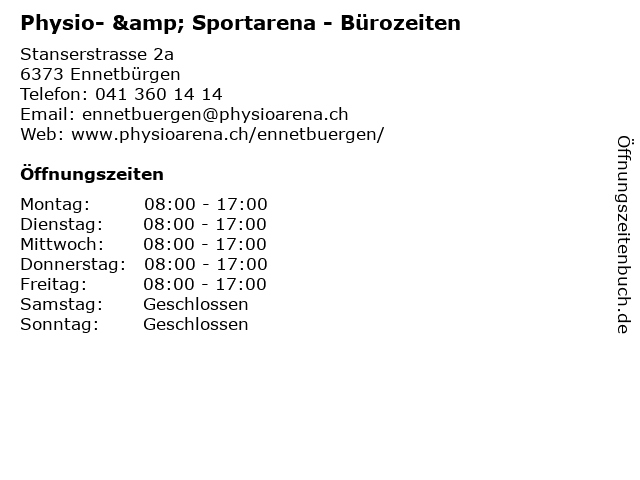 Öffnungszeiten Physio- & Sportarena - Bürozeiten in Ennetbürgen anzeigen