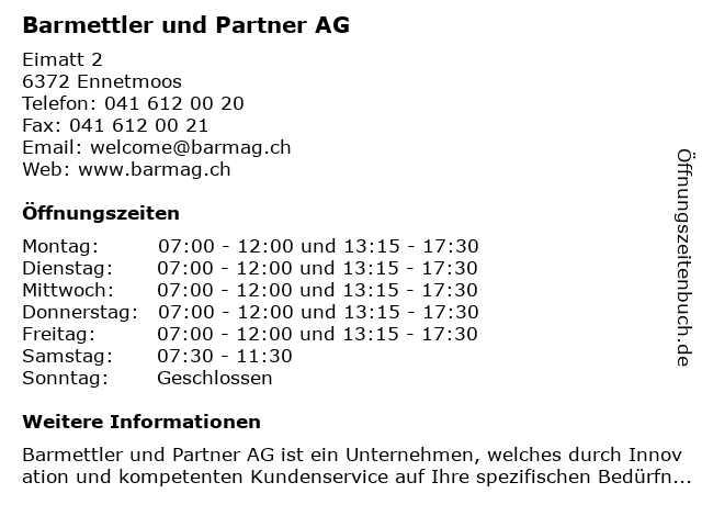 | Öffnungszeiten Barmettler und Partner AG in Ennetmoos anzeigen | |