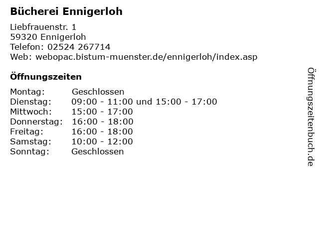 | Öffnungszeiten Bücherei Ennigerloh in Ennigerloh anzeigen | |
