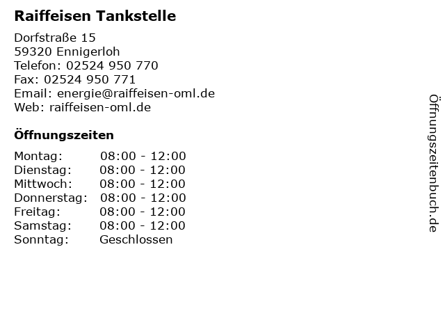 | Öffnungszeiten Raiffeisen Tankstelle in Ennigerloh anzeigen | |
