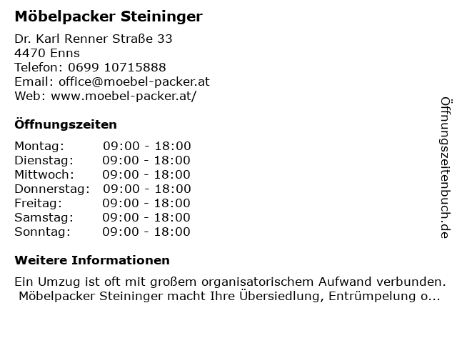 | Öffnungszeiten Möbelpacker Steininger in Enns anzeigen | |