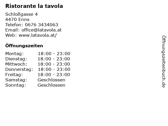 | Öffnungszeiten Ristorante la tavola in Enns anzeigen | |