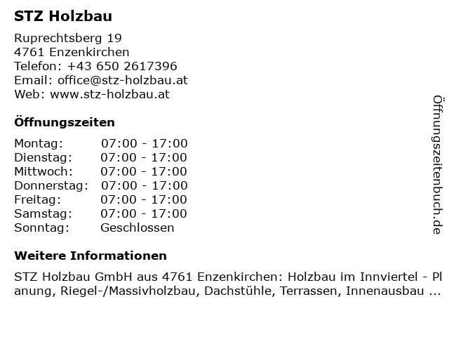 | Öffnungszeiten STZ Holzbau in Enzenkirchen anzeigen | |