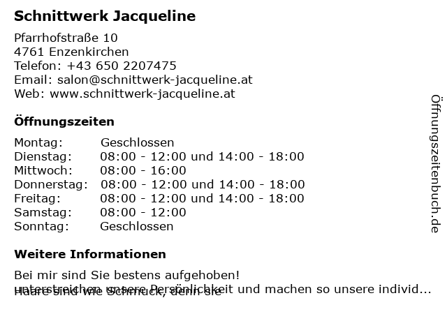 | Öffnungszeiten Schnittwerk Jacqueline in Enzenkirchen anzeigen | |