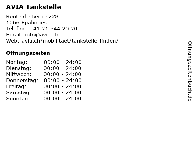 | Öffnungszeiten AVIA Tankstelle in Epalinges anzeigen | |