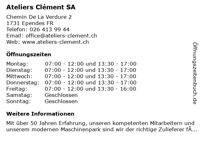 | Öffnungszeiten Ateliers Clément SA in Ependes FR anzeigen | |