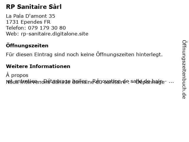 | Öffnungszeiten RP Sanitaire Sàrl in Ependes FR anzeigen | |