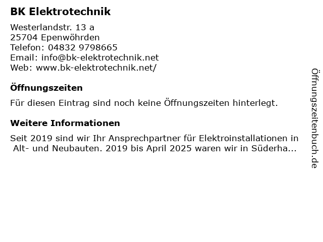| Öffnungszeiten BK Elektrotechnik in Epenwöhrden anzeigen | |